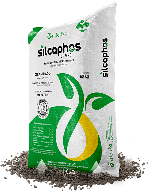 Fertilizante orgánico granulado rico en Fósforo, Calcio, Silicio y Carbono Orgánico, fundamental para el crecimiento y desarrollo de la planta.